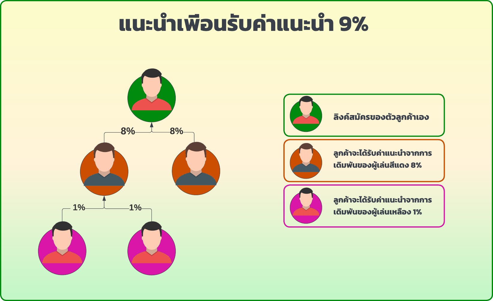 แล้วอีก 1% คือชั้นที่ 2 ค่ะ เพราะเมื่อนาย A สมัครตรงจากคุณเค้าก็จะมีลิ้งค์แบบคุณเหมือนกัน และเมื่อนาย A ที่อยู่กับเราไปชวนนาย B มาสมัคร คุณจะได้รายได้จากนาย B ด้วยอีก 1% โดยคุณไม่ต้องหาเองเลยค่ะ รวมทั้งหมด 9%